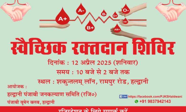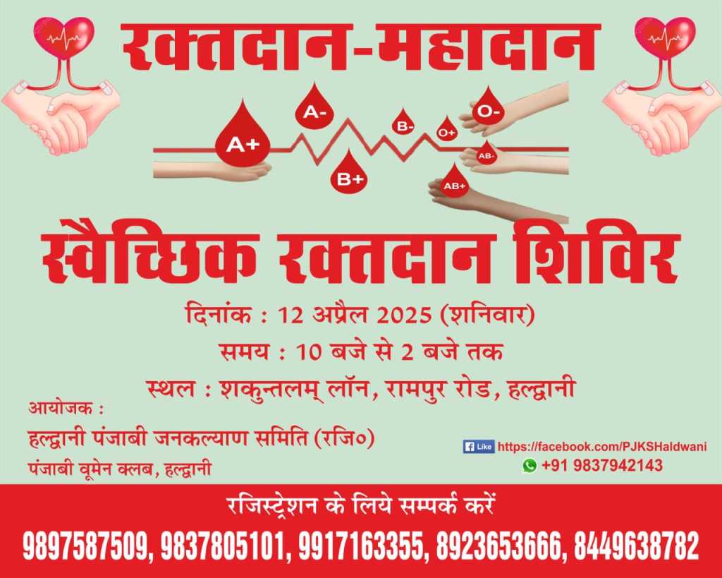 हल्द्वानी : पंजाबी जनकल्याण समिति का रक्तदान शिविर 12 अप्रैल को हल्द्वानी पंजाबी जनकल्याण समिति द्वारा बैसाखी पर्व के उपलक्ष में 12 अप्रैल दिन शनिवार को स्वैच्छिक रक्तदान शिविर, शकुंतलम बैंक्विट हॉल, रामपुर रोड, हल्द्वानी में प्रातः 10:00 बजे से दिन में 2:00 बजे तक लगाया जा रहा है ।