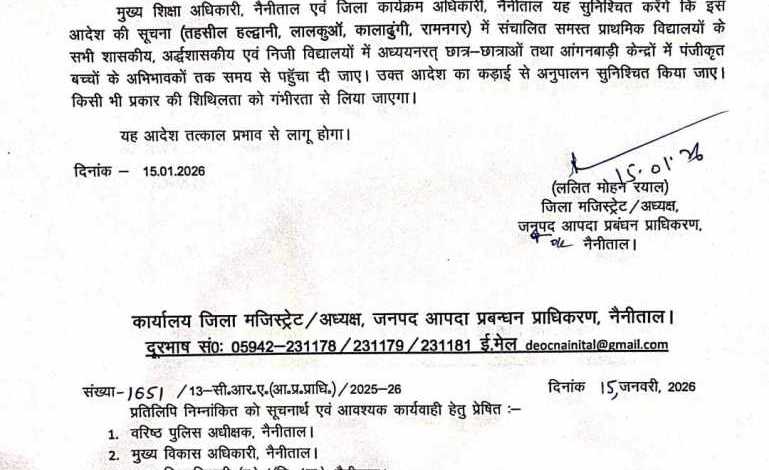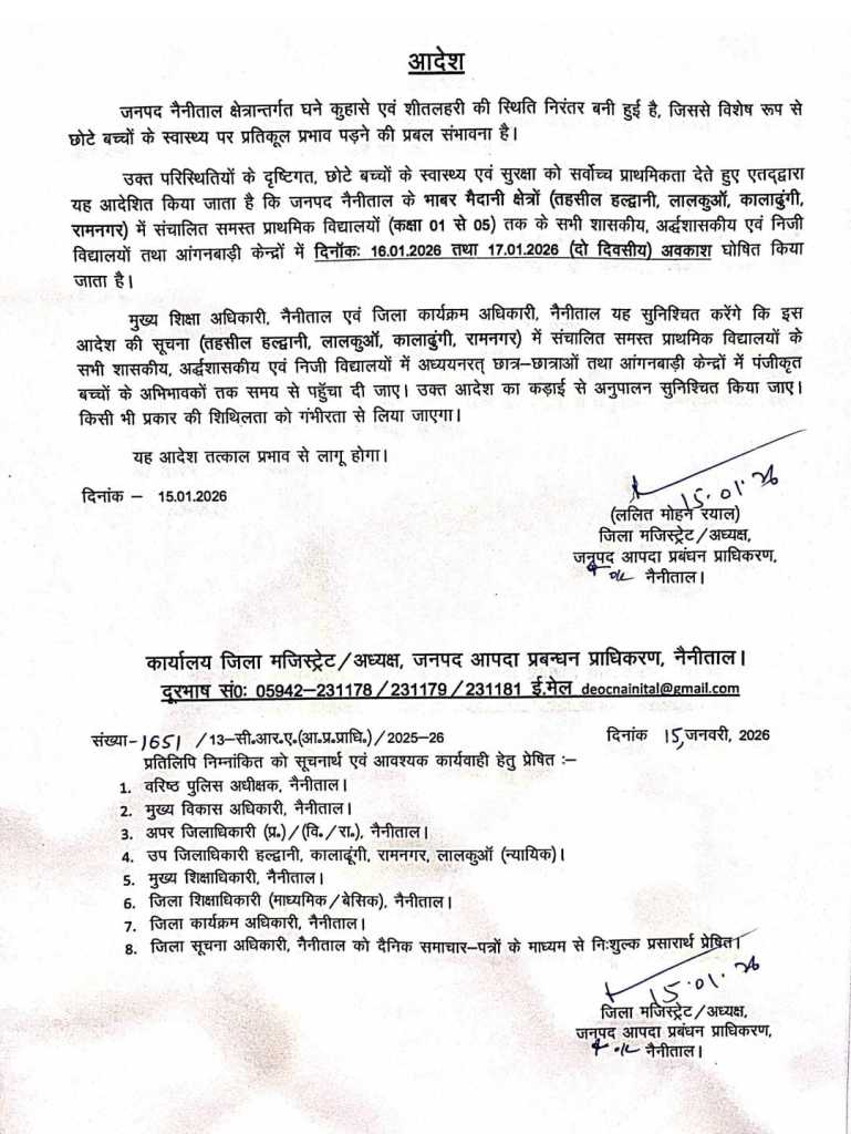 हल्द्वानी : नैनीताल जिले के इन तहसीलों में दो दिन का अवकाश घोषित, नैनीताल जिले क्षेत्र अंतर्गत घने कोहरे एवं शीतलहरी की स्थिति बनी हुई है जिससे विशेष रूप से छोटे बच्चों के स्वास्थ्य पर प्रतिकूल प्रभाव पड़ने की प्रबल संभावना है जिसके चलते नैनीताल जिले के भाबर मैदानी क्षेत्र तहसील हल्द्वानी, लालकुआं, कालाढूंगी रामनगर में संचालित समस्त प्राथमिक विद्यालयों कक्षा एक से कक्षा 5 तक के सभी शासकीय ,अर्द्धशासकीय एवं निजी विद्यालयों तथा आंगनबाड़ी केन्द्रो में दिनांक 16/1/2026 तथा 17 /1 /2026 को दो दिवसीय अवकाश घोषित किया गया है, प्रशासन ने स्पष्ट किया है कि घने कोहरे और शीतलहर के कारण विशेष रूप से छोटे बच्चों के बीमार पड़ने की आशंका बढ़ गई है इसी को देखते हुए ऐतिहासिक कदम उठाया गया है आदेश में मुख्य शिक्षा अधिकारी एवं जिला कार्यक्रम अधिकारी को निर्देशित किया गया है की अवकाश की सूचना समय से अभिभावकों तक पहुंच जाए जिला प्रशासन ने चिता में दी है कि आदेश का शक्ति से पालन कराया जाएगा और किसी भी स्तर पर लापरवी सामने आने पर संबंधित के खिलाफ कार्य की जाएगी आदेश तत्काल प्रभाव से लागू हो गया है