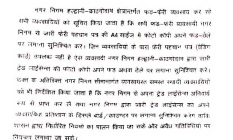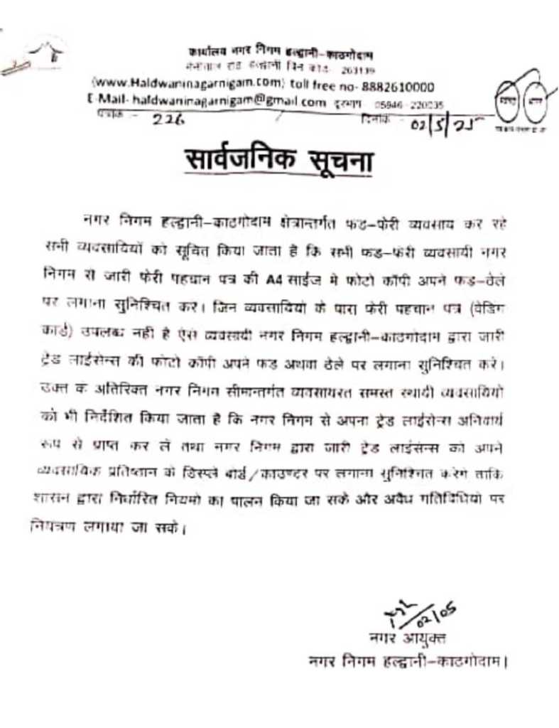 हल्द्वानी : नगर निगम हल्द्वानी-काठगोदाम क्षेत्रान्तर्गत फड़-फेरी व्यवसाय कर रहे व्यवसायियों को सूचित किया जाता है कि सभी फड-फेरी व्यवसायी नगर निगम से जारी फेरी पहचान पत्र की A4 साईज में फोटो कॉपी अपने फड-ठेले पर लगाना सुनिश्चित कर। जिनके फड़ फेरी पहचान पत्र (वेडिंग कार्ड) उपलब्ध नहीं है ऐसे व्यवसायी नगर निगम हल्द्वानी-काठगोदाम द्वारा जारी ट्रेड लाईसेन्स की फोटो कॉपी अपने फड अथवा ठेले पर लगाना सुनिश्चित करें।