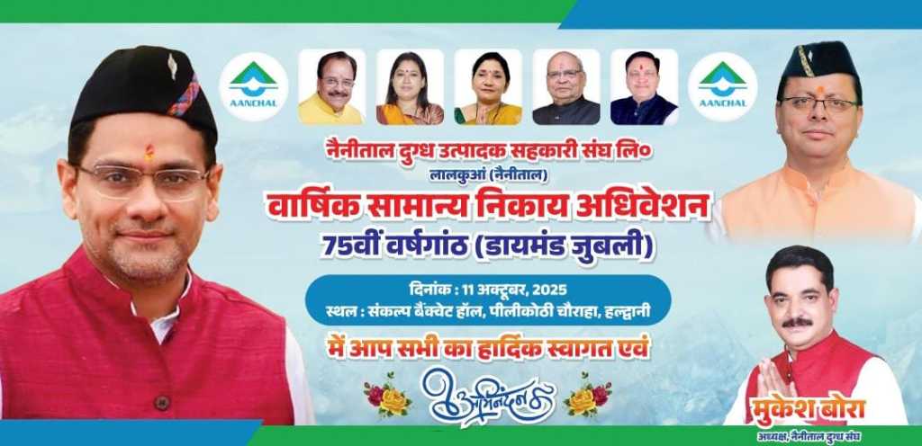 हल्द्वानी : नैनीताल आँचल दुग्ध उत्पादक सहकारी संघ लिमिटेड द्वारा शनिवार कल को हल्द्वानी स्थित संकल्प बैंक्विट हॉल में आयोजित वार्षिक सामान्य निकाय अधिवेशन (एजीएम) के दौरान देश के प्रधानमंत्री नरेंद्र मोदी द्वारा शुरू की जाने वाली ‘प्रधानमंत्री धन-धान्य कृषि योजना’ का सीधा प्रसारण (लाइव टेलीकास्ट) दिखाया जाएगा। इस दौरान प्रधानमंत्री किसानों से भी सीधा संवाद करेंगे।