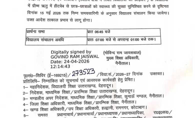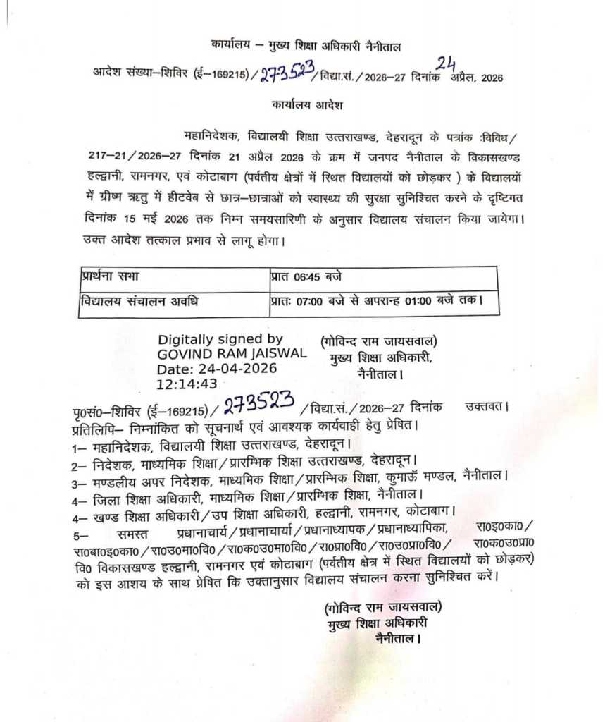 नैनीताल – जनपद नैनीताल में बढ़ती गर्मी के बीच स्कूली बच्चों के स्वास्थ्य को ध्यान में रखते हुए शिक्षा विभाग ने विद्यालयों के समय में बदलाव किया है। मुख्य शिक्षा अधिकारी नैनीताल द्वारा जारी आदेश के अनुसार हल्द्वानी, रामनगर और कोटाबाग विकासखंड के विद्यालयों में नई समय-सारिणी लागू की गई है। आदेश के मुताबिक अब विद्यालयों में प्रार्थना सभा सुबह 6:45 बजे आयोजित होगी, जबकि कक्षाएं सुबह 7:00 बजे से दोपहर 1:00 बजे तक संचालित की जाएंगी। यह व्यवस्था 15 मई 2026 तक प्रभावी रहेगी। शिक्षा विभाग ने स्पष्ट किया है कि यह आदेश पर्वतीय क्षेत्रों में स्थित विद्यालयों पर लागू नहीं होगा। मैदानी क्षेत्रों में बढ़ते तापमान और संभावित हीटवेव के खतरे को देखते हुए यह कदम उठाया गया है, ताकि छात्र-छात्राओं को गर्मी से राहत मिल सके और उनका स्वास्थ्य सुरक्षित रहे। आदेश को तत्काल प्रभाव से लागू करते हुए सभी विद्यालयों को निर्देश दिए गए हैं कि नई समय-सारिणी का सख्ती से पालन सुनिश्चित किया