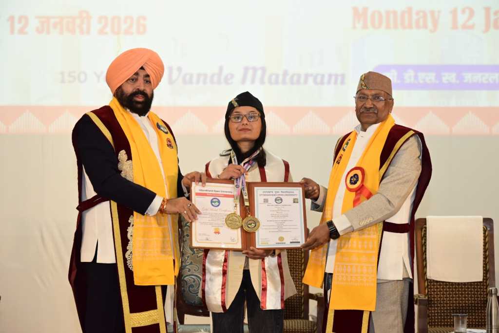 हल्द्वानी : उत्तराखण्ड मुक्त विश्वविद्यालय का दशम दीक्षांत समारोह सोमवार, 12 जनवरी 2026 को गरिमामय एवं भव्य वातावरण में सम्पन्न हुआ। समारोह की अध्यक्षता विश्वविद्यालय के कुलाधिपति एवं प्रदेश के महामहिम राज्यपाल ले. जनरल (से.नि.) गुरमीत सिंह ने की। इस अवसर पर कुल 18,146 विद्यार्थियों को स्नातक, स्नातकोत्तर एवं डिप्लोमा स्तर की उपाधियाँ प्रदान की गईं, जबकि 6 शोधार्थियों को पीएच.डी. की उपाधि से सम्मानित किया गया।समारोह का शुभारम्भ शोभायात्रा, राष्ट्रगान एवं दीप प्रज्वलन से हुआ। कुलपति प्रो. नवीन चन्द्र लोहनी ने शैक्षणिक सत्र 2024–25 की प्रगति रिपोर्ट प्रस्तुत करते हुए विश्वविद्यालय के शैक्षणिक विस्तार, शोध गतिविधियों एवं शिक्षण गुणवत्ता सुदृढ़ीकरण के प्रयासों की जानकारी दी। इसके उपरान्त कुलाधिपति द्वारा विधिवत उपाधि-प्रदान की प्रक्रिया सम्पन्न कराई गई।पीएच.डी. उपाधि प्राप्त शोधार्थीशिक्षाशास्त्र विद्याशाखा: संजना रौतेला, नमिता बोरा, लता आर्यामानविकी विद्याशाखा: बसुदेव प्रसाद, शशांक शर्मा, कमल डिमरीकुलाधिपति स्वर्ण पदक प्राप्त शिक्षार्थीपुस्तकालय एवं सूचना विज्ञान: प्रेरणा भट्टशिक्षाशास्त्र: प्रवेश कुमारविश्वविद्यालय स्वर्ण पदक प्राप्त शिक्षार्थी (कुल 28)समाज विज्ञान विद्याशाखाअंकित ढौंडियाल, हितेश चंद्रा, रेखा गैड़ा, सबीहा ख़ान, कुमारी दीक्षा, प्रियंका तिवारीशिक्षाशास्त्र विद्याशाखाबलवंत सिंह, रजनी गुरे, सौम्या कांडपाल, पंकज जोशी, अर्पिता शर्मा, जागृति चौहानमानविकी विद्याशाखाहिमांशु ओली, कुमारी हेमवंती, दीपिका, प्रवेश कुमारस्वास्थ्य विज्ञान विद्याशाखाकुसुमलता, सुमित गिरिप्रबंध अध्ययन एवं वाणिज्य विद्याशाखास्वाति बिष्ट, अंशुल अग्रवाल, अंकिता नेगीविज्ञान विद्याशाखायोगिता रावत, मोनिका, अमित कुमार, हर्षिता मेहता, रैना शुक्ला, ईशिता पांडेप्रायोजित स्वर्ण पदकलाला देवकी नंदन नंद किशोर एजेंसीज स्मृति स्वर्ण पदक (पुस्तकालय एवं सूचना विज्ञान): प्रेरणा भट्टश्रीमती शीला देवी, धर्मपत्नी लाला ओम प्रकाश स्मृति स्वर्ण पदक (मानविकी): प्रवेश कुमारश्रीमती भगवती देवी, लाला नंद किशोर स्मृति स्वर्ण पदक (प्रबंध अध्ययन एवं वाणिज्य): अंकिता नेगीकल्याण भवति समिति पदक (शिक्षाशास्त्र): सौम्या कांडपालदीक्षांत समारोह में कुलाधिपति द्वारा पीएच.डी. एवं स्वर्ण पदक प्राप्त विद्यार्थियों के साथ समूह-फोटोग्राफ लिया गया। समारोह के दौरान विश्वविद्यालय की नवनिर्मित शौर्य दीवार, हिंदी वेबसाइट, ‘प्रगति के सोपान’ तथा त्रैमासिक पत्रिका ‘उड़ान’ का लोकार्पण किया गया। साथ ही उत्कृष्ट शैक्षणिक योगदान हेतु इस अवसर पर विश्वविद्यालय के 06 शिक्षकों को प्रशस्ति-पत्र प्रदान किए गए, 